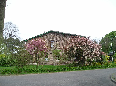 Hier wohnen wir! Wie sie sehen, ein schoener alter Hof, mit Kopflinden vor dem Haus die im Herbst beschnitten wurden und umsäumt von blühenden Bäumen.